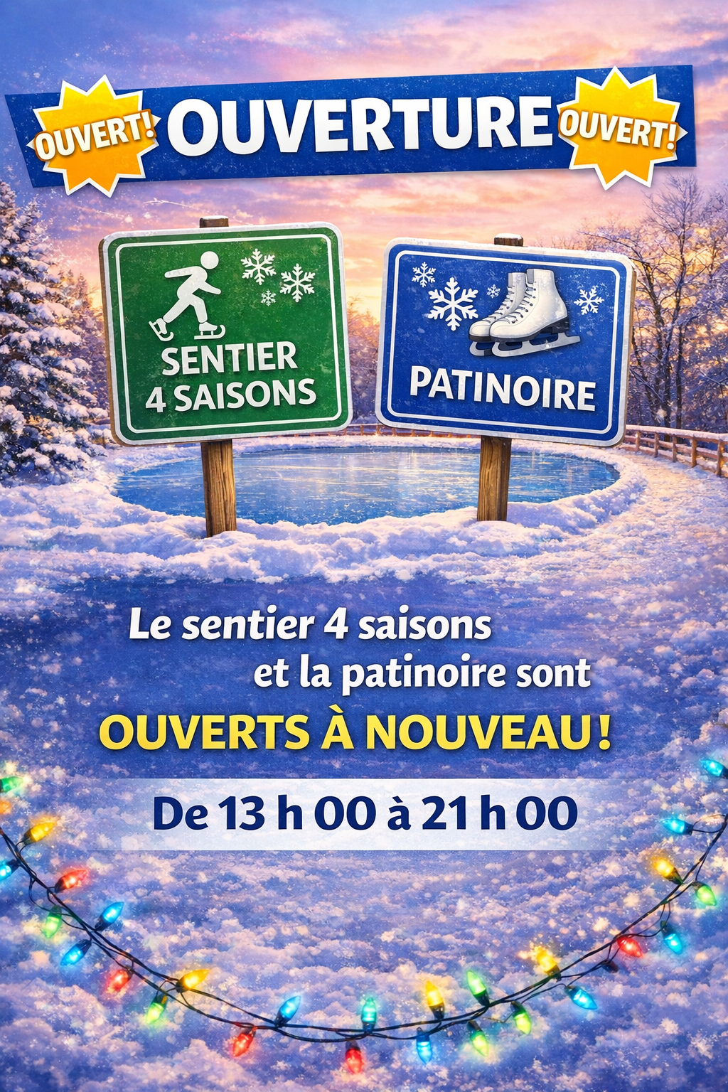 Patinoire et sentier glacé 4 saisons ouvert à tous Surveillez la page Facebook pour vérifier si la patinoire et le sentier 4 saisons sont ouverts à cause des changements de température. Partarger :